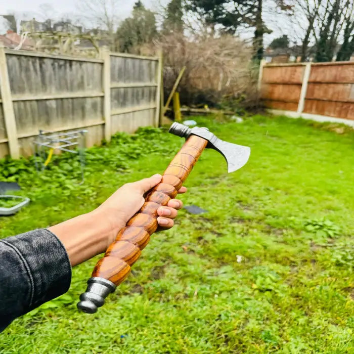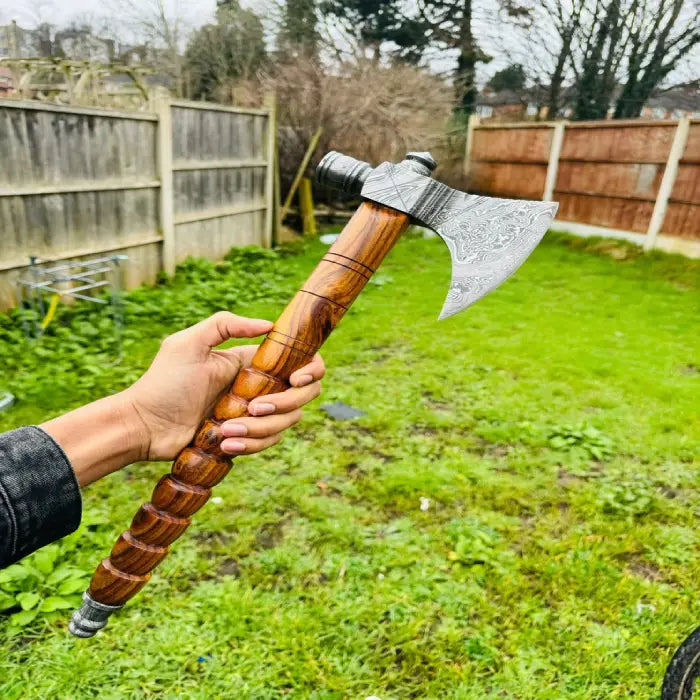 This handmade tomahawk is made of Damascus steel and exclusively design for multi purposes and limit the user time and effort. Handle is made of wood and designed for stronger grip and composure. It is sharp and easy to us while you are out for comping. It is a must have outdoor picnic gear to help you out while making a small camp. It helps users to cut bushes and trees and give them a decent look.